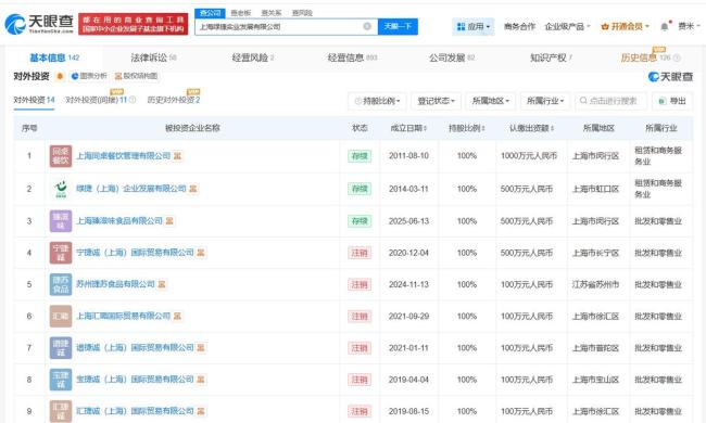 闵行区市场监视办理局也关心到这一事务,并已展开查询拜访。涉事公司上海绿捷实业成长无限公司成立于2014年9月,代表报酬葛均锋,注册本钱5000万人平易近币,运营范畴包罗餐饮办理、消息征询办事及食用农产物批发等。该公司由GreenExpress Foods, Limited全资持股,对外投资了14家企业,目前仅有3家企业处于存续形态,其余11家企业已登记。此外,该公司曾多次因生命权、身体权胶葛被告状。