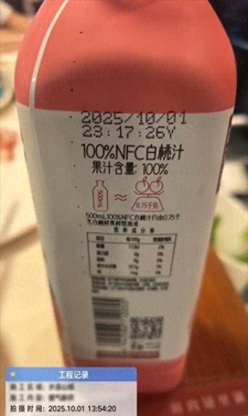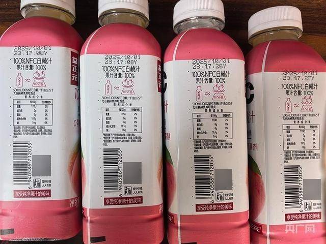 记者从王先生供给的照片中看到,该白桃汁饮料外包拆显示出产厂家为山东养力多生物科技无限公司。四瓶饮料上的出产日期笔迹清晰,均标注为“2025年10月1日23时17分”。